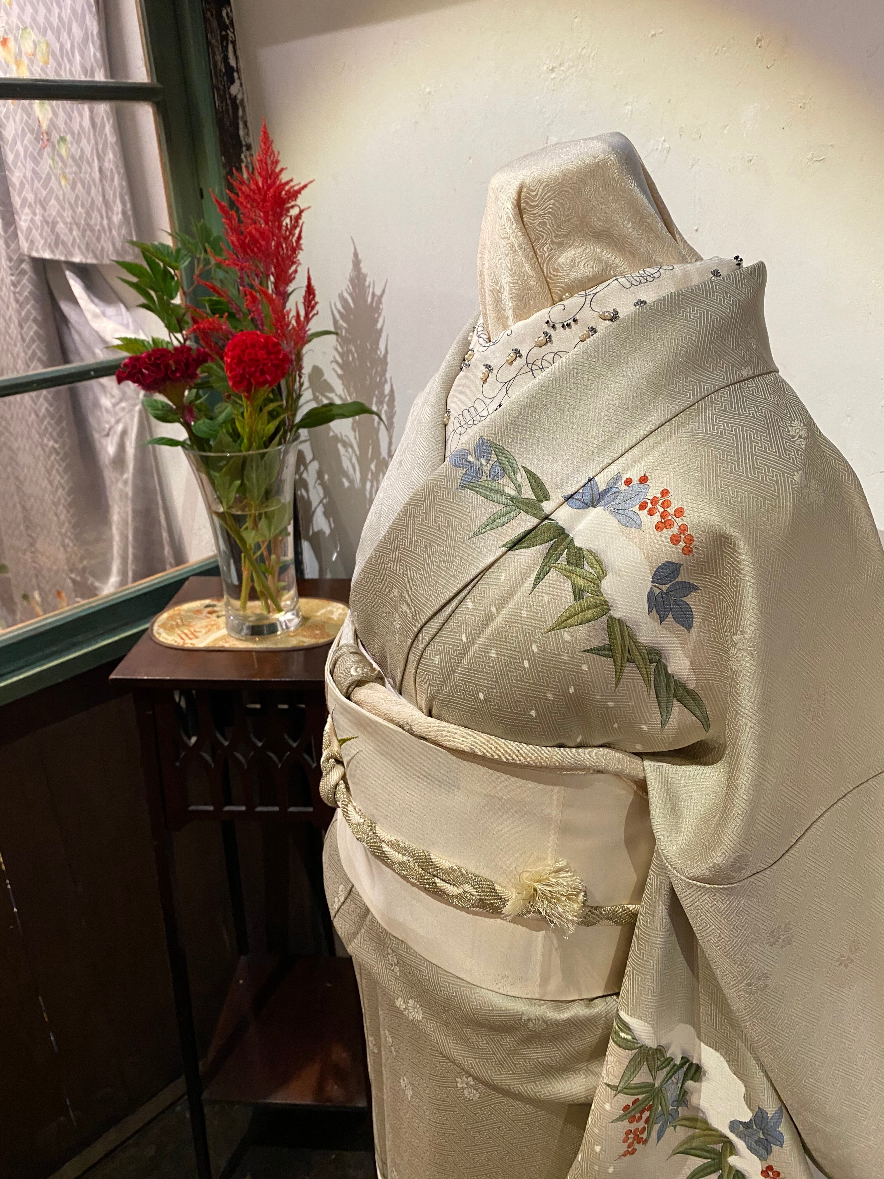 アイボリー白に地紋にうっすらと雲のような紋様が浮かびあがり水辺のような感じをだしています。