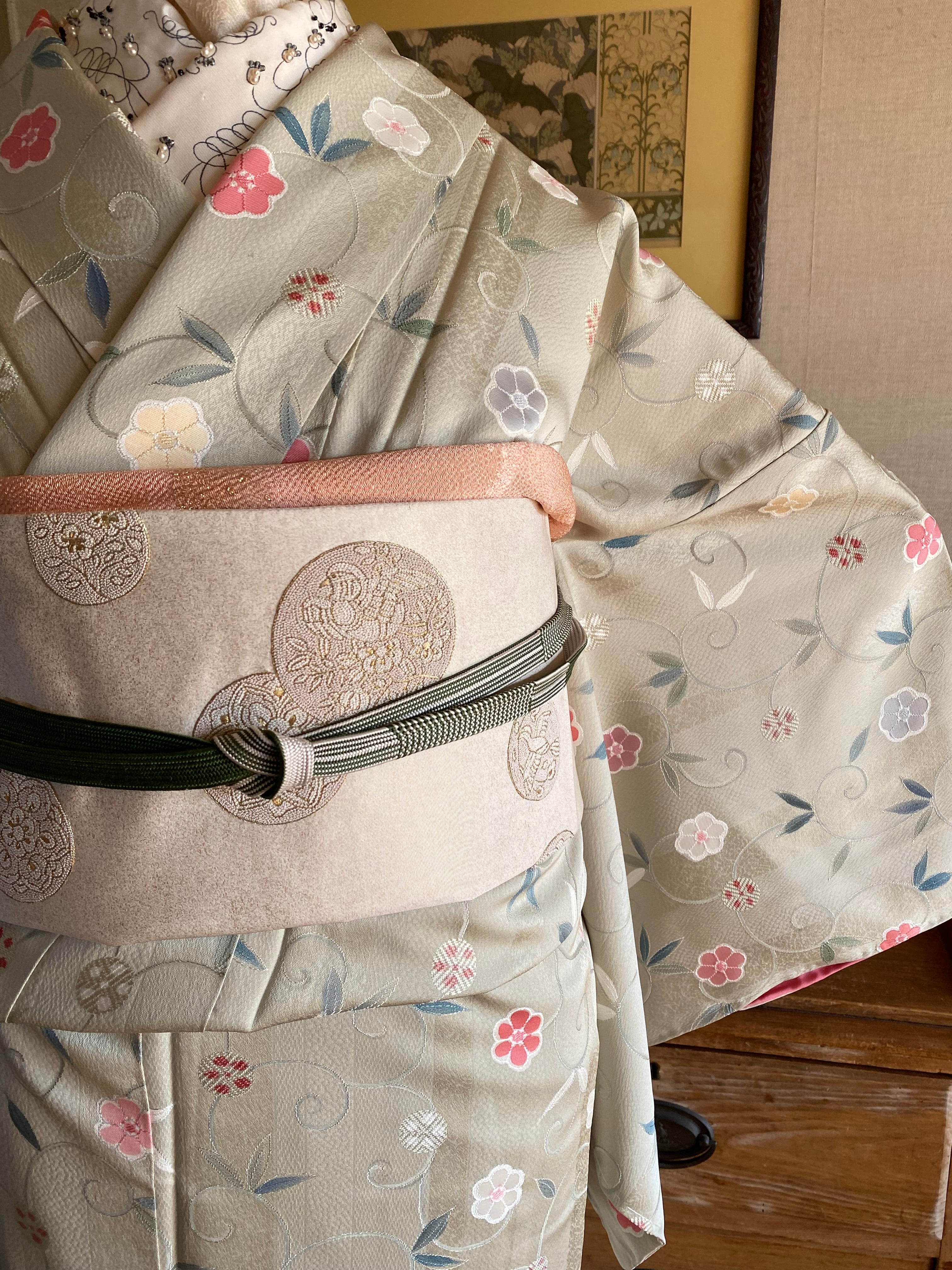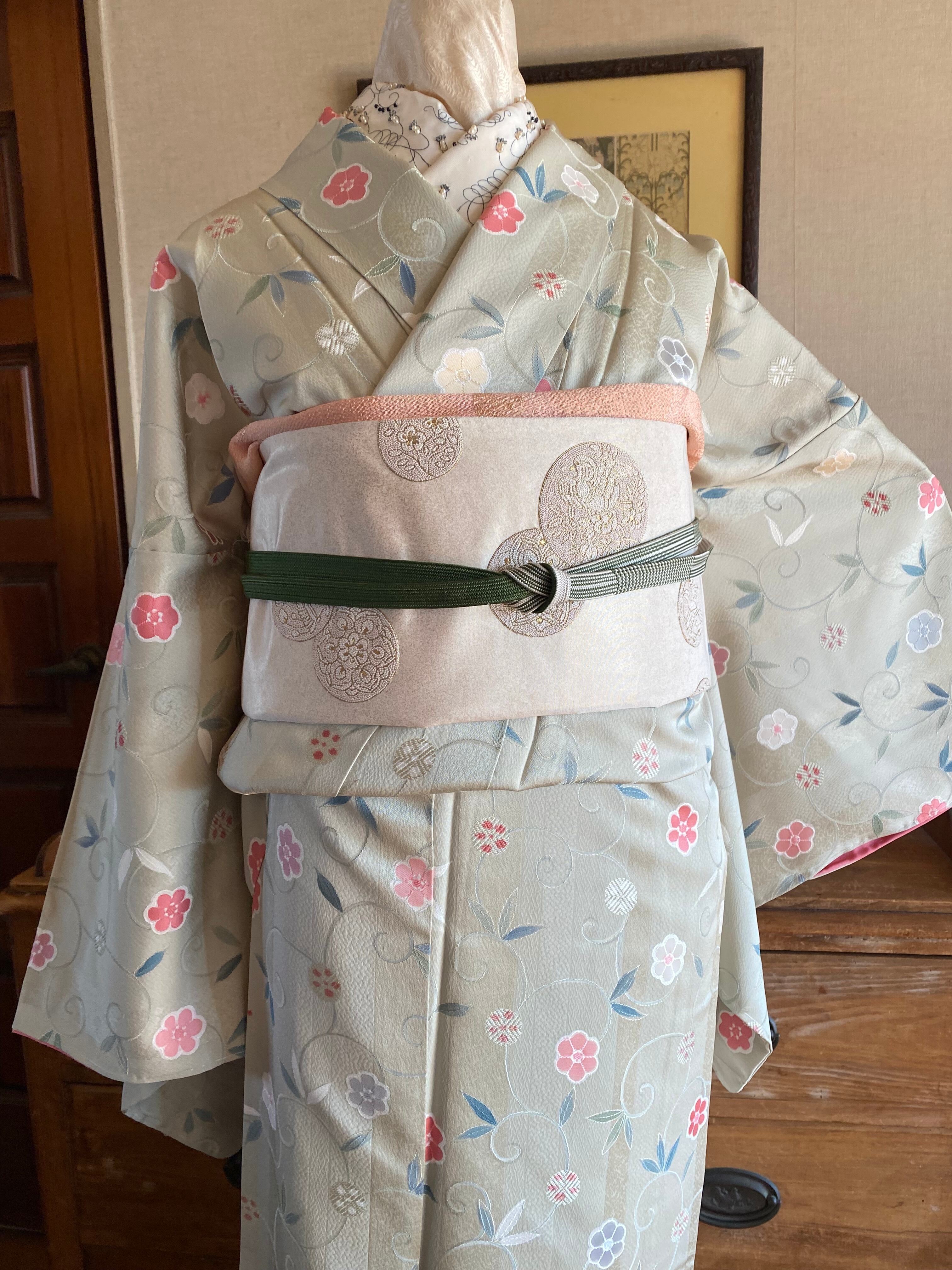さわやかなペパーミントグリーンの地色にやさしいピンク、白の梅の花、蔓草 紋様が美しいです。