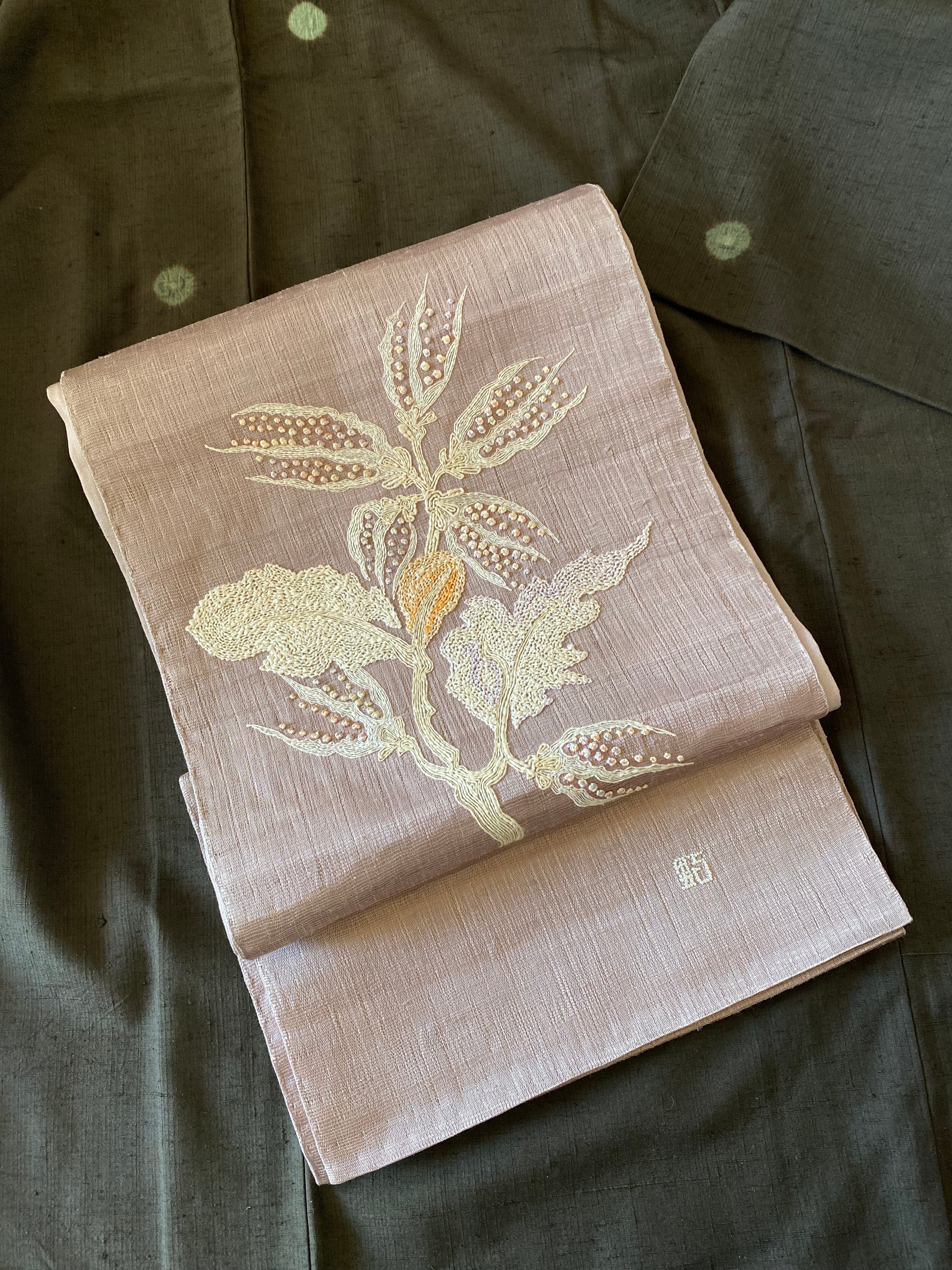 小さなつぶつぶ刺繍 野の草花 薄藤色 袋帯
